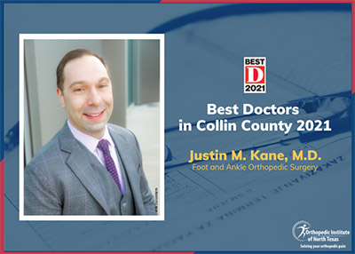 Dr. Justin Kane, M.D, won the recognition of Top Doctor by Living Well Magazine in the “Podiatrist, Orthopedic Surgeon” category. Dr. Kane specializes in foot and ankle problems ranging from bunions and hammertoes to complex reconstructive procedures and limb salvage surgeries at the Orthopedic Institute of North Texas (OINT).